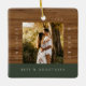 Celebrate your engagement with this elegant mid-century modern ornament, featuring a stylish faux brown wood and white two-tone design. A bold dark olive green stripe along the bottom highlights the couple’s name, while a minimalist square frame displays your favorite engagement photo. With one photo on each side, this ornament is a beautiful double-sided keepsake. The phrase “Engaged & Merry”, the year, and your names are displayed in a clean, modern font around the image – perfect for adding a personal touch to your holiday decor or gifting to a newly engaged couple. Design and Layout by ©Moodthology Papery