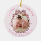 Celebre la llegada de su pequeño hijo con este adorno de estadísticas de natalidad rosadas personalizadas, bellamente diseñadas en un suave estilo inspirado en la coqueta. Con un lindo y brillante marco de arco en ambos lados, este adorno resalta la foto más dulce de su bebé de un lado y los detalles del parto de su personalizado —como fecha y hora— del otro. Los suaves tonos rosas y el elegante diseño del arco aportan un toque femenino y encantador a la decoración de los árboles de Navidad. Perfecto como primer obsequio de Navidad de un bebé, regalo recién nacido o regalo de vacaciones para padres orgullosos, este adorno es un tesoro atemporal que captura la alegría de la primera temporada de fiestas de su bebé.