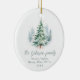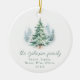 Personalized family Christmas ornament features watercolor pine tree and elegant script family name in sage green, modern and simple.
