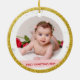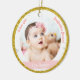 Primera niña navideña personalizada de moda, elegante y adorable Ornamento para un padrino con un marco blanco con copos de nieve y estrellas que tiene una apertura redonda para una foto horizontal personalizado en la parte delantera y trasera, y una banda rosa curvada en cada lado en la que aparece el nombre del bebé con un elegante tipo de letra / tipografía, y, en la parte trasera, otra foto y el texto personalizado "Primera Navidad 202Y" ¡asegúrate de personalizar el año!). Este diseño incluye en la parte delantera las palabras "¡Te amo, padrino Jason!", que puedes personalizar o borrar. Con un marco exterior (falso) purpurina de oro.