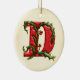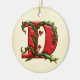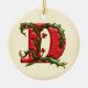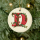 Los ornamentos cones monograma hermosos del navidad que tienen una letra roja D adornaron con acebo contra un fondo de mirada antiguo del moreno. La imagen de fondo adaptable puede ser quitada si usted prefiere un fondo blanco, o usted puede cambiarlo al color a su opción con el botón del personalizar. Texto adaptable en el lado trasero para el mensaje de su opción.