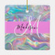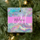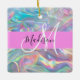 Nombre de monograma iridiscente holográfico del arco iris goril y adorno cerámico inicial. Su nombre personalizado y su monograma están escritos en un guión elegante con letras a mano con un fondo rosado. ¡Un regalo perfecto de cumpleaños o Navidades!