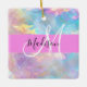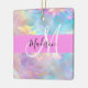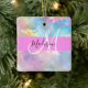 Nombre de monograma iridiscente holográfico del arco iris goril y adorno cerámico inicial. Su nombre personalizado y su monograma están escritos en un guión elegante con letras a mano con un fondo rosado. ¡Un regalo perfecto de cumpleaños o Navidades!