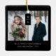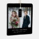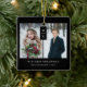 Este elegante y moderno ornamento cuenta con tres de tus fotos personales, con tus monogramas y un lugar para tus nombres y las palabras "nuestra primera Navidad" en texto blanco sobre un fondo negro.