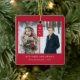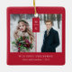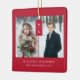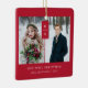 Este elegante y moderno ornamento cuenta con tres de tus fotos personales, con tus monogramas y un lugar para tus nombres y las palabras "nuestra primera Navidad" en blanco sobre un fondo rojo.