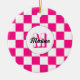 Monograma retro geométrico geométrico blanco y rosado controlado Ornamento. Cuadrados de cuadros geométricos patrón retro Regalo de vacaciones para ella. Baldosa vintage color rosa caliente moderno checker. Personaliza con tu personalizado inicial y nombre.