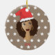 Celebra la temporada navideña con esta belleza natural y su festivo sombrero de Papá Noel encima de todo, fabuloso. Natural Beauty tiene un color negro, rizado, collares en capas y aros dorados sobre un fondo marrón con estrellas blancas.