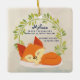 Un adorno con los detalles de nacimiento de tu recién nacido. Diseñado con un fondo de color crema de color grisáceo con formas geométricas tenues y modernas. Encendido sobre la parte superior hay un dibujo personalizado de un zorro naranja lindo durmiendo tranquilamente. Detrás había una hoja verde.