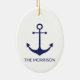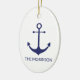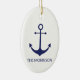 Personalizado Nombre del barco ancla náutica Navidades azul marino y blanco Ornamento cerámico. Diseño elegante y minimalista