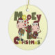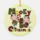 Dos vacas en casquillos de media, regalos del navidad, luces del día de fiesta, bastones de caramelo, y texto rojos que lee el "navidad de Mooey" en las camisetas del día de fiesta, las tazas, las tarjetas, los pegatinas, las bolsas de asas, los relojes de pared, las cajas del recuerdo, los ornamentos, los llaveros, y otra ropa y regalos lindos del día de fiesta del tema de la vaca.