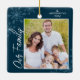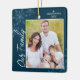 Este adorno navideño cuadrado es un regalo perfecto para cualquier familia. El diseño presenta un marco fotográfico con texto escrito a mano "Nuestra familia" y se acentúa con copos de nieve azul claro en un fondo azul oscuro. Personaliza tu foto, nombre y año favoritos de tu familia.