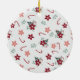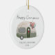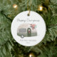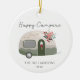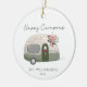 Navidades Camper Retro Green - el ornamento cuenta con un adorable camper retro, todo adornado para las vacaciones con luces de cuerdas, flores de invierno, bayas y luces de cuerdas. Happy Campers está en una tipografía de escritura moderna y en bonito, y se personaliza con el nombre y el año de tu familia. La parte posterior del adorno es un patrón floral de Navidades coordinadores. También estará disponible con una foto en la parte de atrás. El ornamento forma parte de una colección.