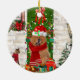Chow Chow Dog sentado afuera de la casa decorada con corona de Navidades, el árbol de Navidad es un perfecto regalo de Navidades para los amantes del perro.