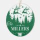 Este divertido ornamento de Navidad verde y blanco muestra el nombre de su familia entre renos que saltan sobre árboles de Navidades con flores tradicionales y campanas de Navidades. Personalice agregando su apellido al hacer el pedido. Hace un gran regalo para la familia.