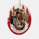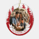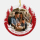 Ornamento navideño moderno y elegante. Diseño con fondo de pinos, nieve, 2 foto familiar, nombre familiar y año. Perfecto como un regalo o un placer.