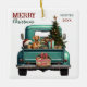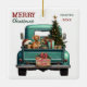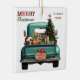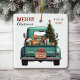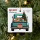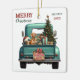 Una verde azulada camioneta azul retro lleva un árbol de Navidad decorado y paquetes de regalo en este adorable adorno navideño de vidrio. Mirar desde el portón trasero es un hermoso perro Vizsla rojo. Un cartel rústico de madera en el parachoque trasero dice "Navidades Cheer". El texto rojo y verde estilizado en la parte superior izquierda dice "FELIZ NAVIDAD", con tu nombre (o el de tu perro) y el año a la derecha. Ambos lados tienen la misma imagen.
