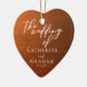 Siga la tendencia de otoño de tonos tierra con nuestro naranja quemado al gradiente marrón caída bodas mantener el adorno navideño. Una simple tipografía blanca personalizado sobre un corazón rústico en forma de regalo para un aspecto minimalista. Los tonos bohemios que recuerdan a la arcilla de terracota resaltan su elegante caligrafía en este regalo personalizado de keepsake con su foto romántica en la espalda.