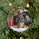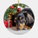 Este adorable ornamento navideño, con un tricolor Dachshund haitiano bajo un árbol de Navidad, es un regalo maravilloso para cualquier amante de Doxie.