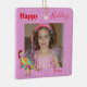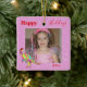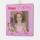 Añada una foto a este divertido ornamento rosado prehistórico del árbol de Navidad de los dinosaurios con un lindo parasaurolophus colorido usando un sombrero de Santa. Felices vacaciones junto con la fecha y los saludos festivos son fáciles de personalizar usando la plantilla para crear un maravilloso keepsake para abuelos, parientes, amigos y chicas que aman los dinos. Anquílosauro, dinosaurios festivos de velociraptor y pterodáctilo. Material gráfico original creado por la artista Catherine Sweetman