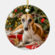 Este adorable ornamento navideño, con un canto y un Greyhound blancos tendidos bajo un árbol de Navidad, es un regalo maravilloso para cualquier amante del Greyhound.