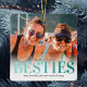 Ornamento personalizado de navidad de los mejores amigos con dos fotos, la palabra "besties" en un adorable gradiente verde azulado de moda, una cita de amistad personalizada y sus nombres.