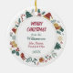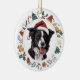 Aquí hay un adorable adorno personalizado para cualquiera que ame un Perro Collie Fronterizo. La parte delantera tiene una acuarela de color blanco y negro con un sombrero de Santa Claus rojo y blanco. La imagen está enmarcada en un círculo colorido formado por varias imágenes del día festivo, incluyendo un muñeco de nieve, campanas, caramelos, medias, ¡caramelos y más! La parte posterior del adorno tiene la misma imagen de corona con el texto de su personalizado en verde y rojo.