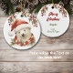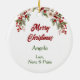 En la parte delantera de este adorable adorable adorable oso polar blanco con un gorra rojo y blanco de Santa Claus y una bufanda de cuello. En la parte superior hay una media corona de hojas huecas con bayas rojas. En la parte posterior, el texto rojo dice "MERRY CHRISTMAS", y hay campos de texto adicionales para personalizar el ornamento. Cuidada para una hija, nieta, hijo o nieto.
