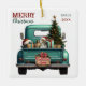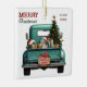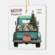 Una verde azulada camioneta azul retro lleva un árbol de Navidad decorado y paquetes de regalo en este adorable adorno navideño de vidrio. Mirar desde el portón trasero es un hermoso perro Beagle Hound. Un cartel rústico de madera en el parachoque trasero dice "Navidades Cheer". El texto rojo y verde estilizado en la parte superior izquierda dice "FELIZ NAVIDAD", con tu nombre (o el de tu perro) y el año a la derecha. Ambos lados tienen la misma imagen.