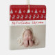 Un árbol de Navidad vintage y un patrón de suéter de argyle de renos en rojo sobre tu texto personalizado para la primera Navidad de tu bebé. Personalizar estos adornos de regalo de vacaciones con una hermosa foto recién nacida bajo el nostálgico diseño de Navidad. Un gran personalizado presente para los nuevos abuelos.