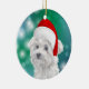 En la parte delantera de este adorno navideño hay una acuarela de un pequeño perro blanco maltés vestido con un gorra rojo brillante de Santa Claus. La imagen se destaca sobre un fondo de bokeh verde degradado y azul. La parte trasera del adorno tiene el mismo fondo con un texto blanco personalizado que actualmente dice "Feliz Navidad feliz Año Nuevo". ¡Es un placer para cualquiera, aunque no seas "propiedad" de un maltés!