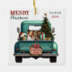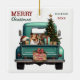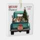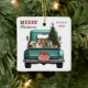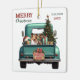Una verde azulada camioneta azul retro lleva un árbol de Navidad decorado y paquetes de regalo en este adorable adorno navideño de vidrio. Mirando desde el portón trasero hay un hermoso perro pastelero de Shetland. Un cartel rústico de madera en el parachoque trasero dice "Navidades Cheer". El texto rojo y verde estilizado en la parte superior izquierda dice "FELIZ NAVIDAD", con tu nombre (o el de tu perro) y el año a la derecha. Ambos lados tienen la misma imagen.