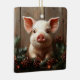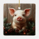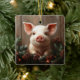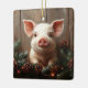 El adorno cerámico presenta una pintura al óleo digital de un bonito cerdo rodeado de conos de pino y guirnaldas de pino con luces de Navidad. El fondo de madera aporta un toque rústico a las obras de arte.