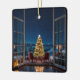 Un bello árbol de Navidad decorado con orgullo se para delante de las puertas francesas, lo que revela una impresionante vista de un paisaje enlucido por la nieve bajo un cielo estrellado. Dos sillones acogedores rodean el árbol, invitando a la relajante contemplación y a la alegría festiva. El cálido resplandor de las luces de los Navidades y una vela parpadeante crean un ambiente de paz y tranquilidad.