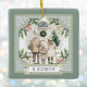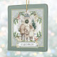 Este adorno navideño boho de moda presenta una hermosa escena familiar en tonos suaves contra el verde de sabio suave. La escena incluye a una familia de tres personas con abrigos y gorras cremosos, de pie o carnada en una puerta decorada. La obra fue creada por Digital Designs de Victoria. El nombre o mensaje de tu familia aparece en una caja adornada con flores en la parte inferior, y las bayas, la vegetación y otros adornos proporcionan un bonito acento. Este adorable adorno tiene una paleta de color boho y heather, con ambos lados mostrando el mismo diseño.