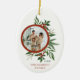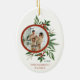 Celebrar la temporada de vacaciones con este hermoso ornamento cerámico de la familia de Navidades Foto Holly Wreath Oval. La foto está impresa en la parte delantera y trasera para facilitar la decoración de los árboles.