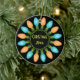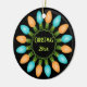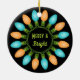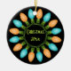 Este ornamento cerámico con texto fácil de personalizar en ambos lados presenta un gráfico de Navidades coloridos que representa un círculo de bombillas festivas en azul y naranja.