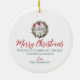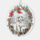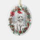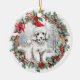 Un adorno navideño lindo con un cachorro de perro caniche blanco dulce en un sombrero de Santa en Navidades y corona de berry. Perro personalizado, cachorro, adorable adorno navideño animal (texto en la parte trasera).