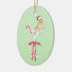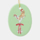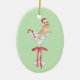 Este adorno de cerámica tiene un retrato acuarela de un perro dachshund rubio de pelo largo sentado en un vaso de martini con un bastón de caramelo con un sombrero de santa.