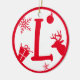 Navidades temáticos, letra monograma L, en rojo sobre fondo blanco. El rojo y el blanco se pueden modificar haciendo clic en el enlace "personalizar más adelante". Letra minúscula l con copos de nieve, bauble, cabeza de ciervo y regalo envuelto.