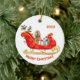 Un adorable Cocker Spaniel Dog, de color buff, se sienta entre los paquetes de regalo envueltos en colores vivos en un trineo ornamental de Navidades rojos y dorados. En la parte superior hay un campo de texto que se puede personalizar para su nombre o el año en curso. En la parte inferior hay otro campo de texto personalizado que dice "Feliz Navidad". Ambos lados del adorno tienen la misma imagen.