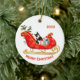 Un adorable gato blanco y negro se sienta entre los paquetes de regalo envueltos en colores vivos en un trineo ornamental de Navidades rojos y dorados. En la parte superior hay un campo de texto que se puede personalizar para su nombre o el año en curso. En la parte inferior hay otro campo de texto personalizado que dice "Feliz Navidad". Ambos lados del adorno tienen la misma imagen.