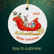 Un bello perro blanco de Bull Terrier se sienta entre paquetes de regalo envueltos de colores en un trineo rojo ornamentado con Navidades dorados. En la parte superior hay un campo de texto que se puede personalizar para su nombre o el año en curso. En la parte inferior hay otro campo de texto personalizado que dice "Feliz Navidad". Ambos lados del adorno tienen la misma imagen.