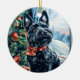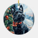 Añade un toque festivo a tu árbol de Navidad con este adorno encantador, que incluye un encantador Terrier Escocés con un arco decorado con copos de nieve. The Scottish Terrier se sienta al lado de un bello árbol de Navidad adornado, con brillantes baudibles rojos y regalos bien envueltos, con una escena de invierno nevada que se ve a través de la ventana. Este adorno de árbol de Navidad captura la calidez y la magia de la temporada navideña, lo que lo convierte en un complemento perfecto a la decoración de sus Navidades. Ideal para los amantes del perro y sobre todo para los amantes de los territorios escoceses, este adorno traerá alegría festiva a cualquier árbol. generativo contenido