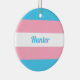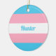 Ornamento navideño de bandera transgénero que se puede personalizar con tu nombre u otro texto. Apoye a sus amigos trans con este lindo regalo que incluye los colores de la bandera transgénero azul, rosa y blanco. Personaliza este bonito presente en azul.