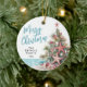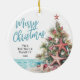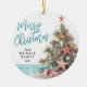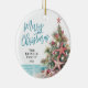 Celebra la temporada con este adorno navideño festivo y de playa, perfecto para una celebración de vacaciones en la costa. El diseño se compone de un caprichoso árbol navideño de conchas de playa, estrellas de mar y coral, con una mezcla de verde, bronceado y un brote de rojo naranja en la estrella de mar en la parte superior, lo que da un toque tropical divertido a tu decoración de vacaciones. El fondo del diseño muestra la arena suave y las suaves olas del océano azul verde azulado, lo que crea un ambiente relajado. "Feliz Navidad" aparece en la parte superior en una mezcla de fuentes azules y negras, usando una alegre mezcla de escritura y tipografía sérica. Su nombre familiar o texto personalizado se muestra debajo del árbol, con espacio para añadir un año para un toque personal. El mismo diseño está impreso en ambos lados, lo que lo convierte en un toque de encanto desde todos los ángulos. Se pueden personalizar todo el texto, las fuentes y los colores. Una gran adición a su árbol de temática playera o un regalo para todos los que les guste unas vacaciones cálidas.