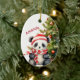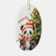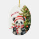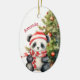 ¡Aquí hay un hermoso adorno de keepsake para esa hija especial, sobrina o nieta! En la parte delantera aparece una imagen de un adorable oso panda vestido con su gorra y bufanda de invierno. Se sienta frente a un árbol de Navidad decorado. El nombre de su hijo está en rojo en la parte superior izquierda. La parte posterior del adorno tiene otra imagen del oso sosteniendo una flor roja en maceta, y tiene varios campos de texto para su personalizar. ¡Haz que diga lo que quieras!