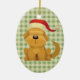 Este adorable ornamento Holiday presenta una maravillosa imagen vintage de un perrito marrón oscuro con una cola menguante y un sombrero de Santa Claus rojo y blanco. La imagen se coloca en un fondo de gingham verde de vacaciones. El otro lado utiliza el mismo patrón de gingham que un marco para el texto personalizado en un fondo blanco. Personalízalo para el regalo adorno de un niño, o haz que diga lo que quieras.