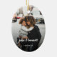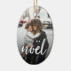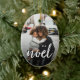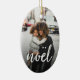 El adorno navideño de moda incluye una foto favorita a cada lado, con "noel" como un texto blanco sobre el texto en letras de pincel de moda. Personalice la parte posterior con la leyenda de su personalizado (que se muestra con los nombres) y el año.