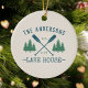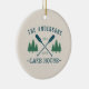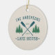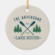 Bonito adorno de cerámica de temática rústica, con su nombre familiar y casa de lago, cabaña, cabaña u otro texto deseado y su fecha establecida, todo en tipografía de estilo rústico. Este diseño único y personalizado cuenta con verde azulados remos azules en barco, palmeras y pinos en un verde suave. El color crema de la base es fácilmente personalizable y combina con la decoración actual. Para ver más diseños como este, siéntase libre de visitar mi tienda aquí en "Zazzle.com/Rustic_Charm". ¡Gracias.