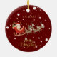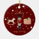 Este llamativo diseño de árbol de Navidad rojo presenta una escena de petardos desnudos para niños con un caballo mecedor, tambores y un soldado de juguete en el frente con un Relieve metalizado dorado de Santa en trineo y falso Feliz Navidad en la parte trasera. Esta decoración personalizada de árbol de Navidad para niños de lujo se completa con un nombre para personalizados de escritura rústico dorado y un mensaje de Feliz Navidad.
